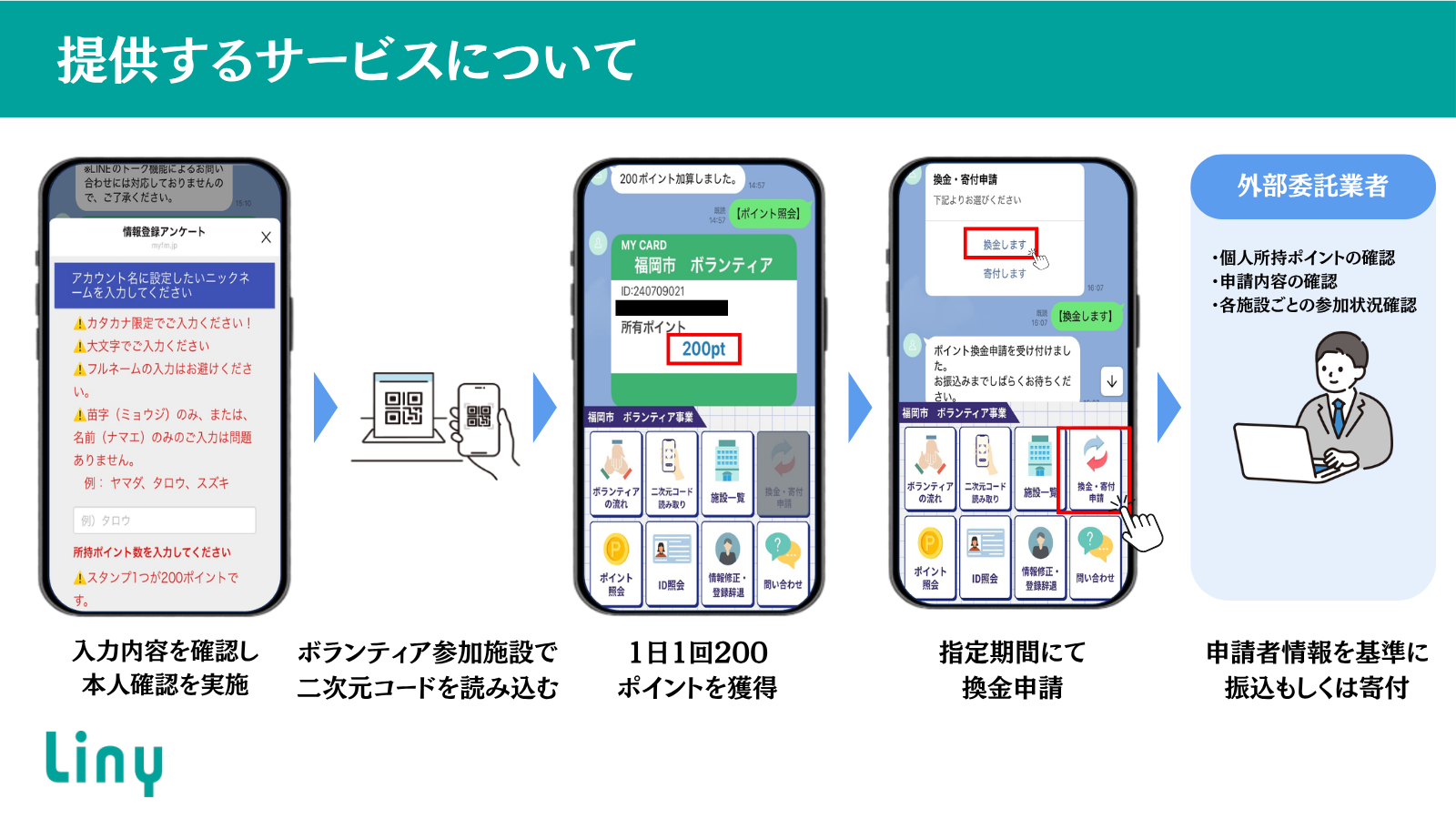 福岡市で実施している介護支援ボランティア事業では、65歳以上の高齢者が介護保険施設等でボランティア活動を行うと「ポイント」が付与され、貯まったポイントを換金または寄付することができます。これまでは、紙によるボランティア登録やポイント管理を行っていましたが、利便性の向上や運営の効率化を目的に「福岡市介護支援ボランティア事業」専用のLINEアカウントを開設しました。