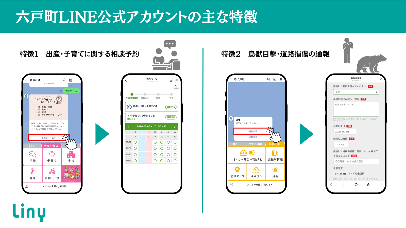 従来、電話や窓口で行っていた予約手続きをオンライン化することや、電話口では情報伝達がしにくい各種不具合の通報などをLINEに集約することで、住民の利便性向上と行政職員の工数削減の実現を目指しています。